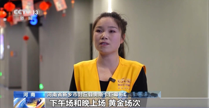 河南省新乡市封丘县奥斯卡巨幕影城司理王瑞艳:下昼场和晚上场是黄金场次,上座率基本上能达到100%,座无隙地。