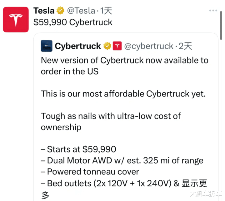 最近特斯拉又有新手脚了。昨天的新音讯,特斯拉在好意思国推出了一款现在最低廉的Cybertruck,售价59990好意思元,折合东说念主民币不祥41万多。这是一辆双电机全轮运行的版块,取代了之前卖得不若何好的后轮运行版,成了这个系列的“新初学款”。亦然Cybertruck购车门槛初度干预6万好意思元以下。
