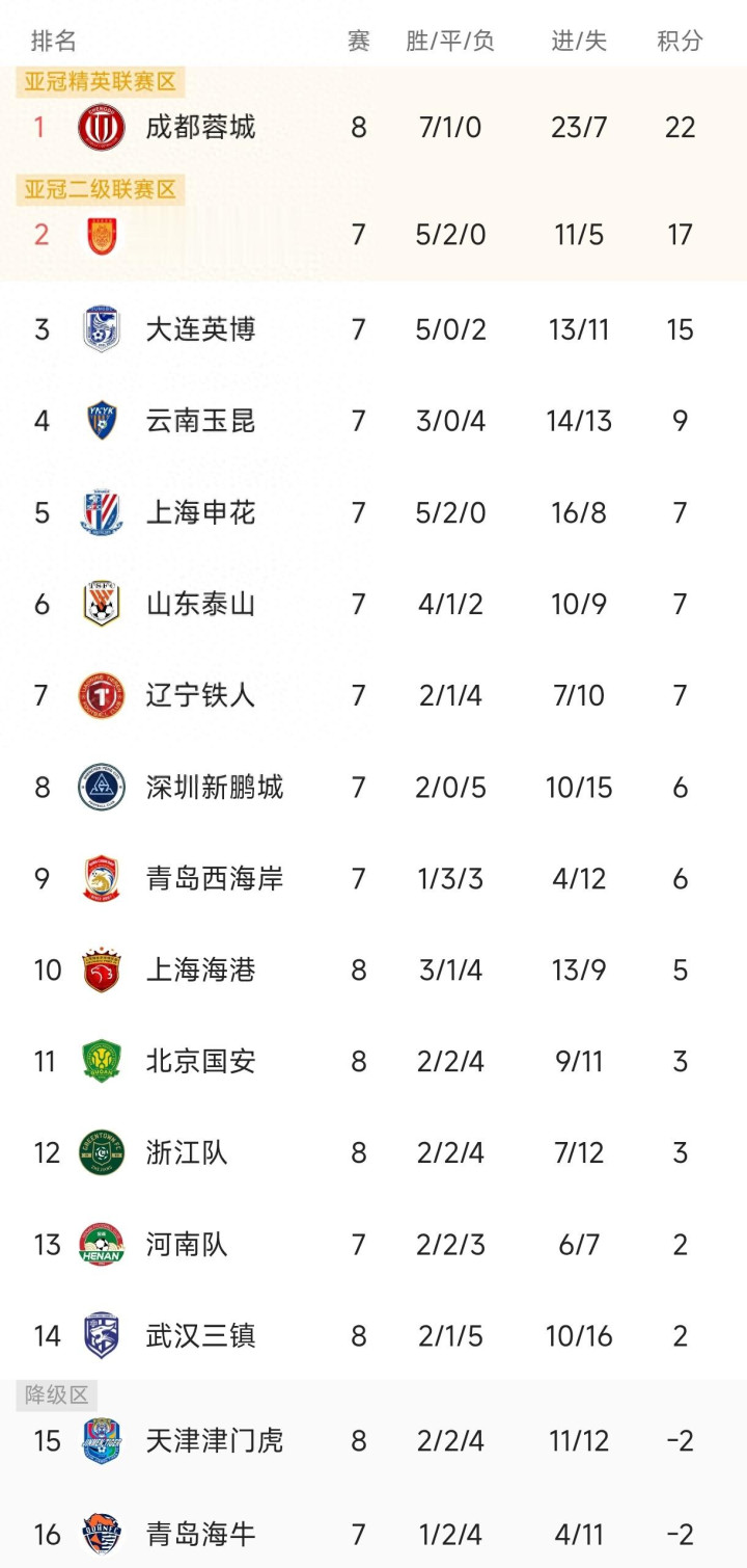 北京时代4月25日晚,中超第8轮戒指了首个比赛日的三场比赛角逐。跟着成王人蓉城主场4-0完胜浙江,北京国安主场爆冷2-4不敌天津津门虎,上海海港主场4-0横扫武汉三镇。在积分榜上,成王人蓉城在多赛一轮的情况下以跳跃第二名重庆铜梁龙5分得益持续领跑积分榜。