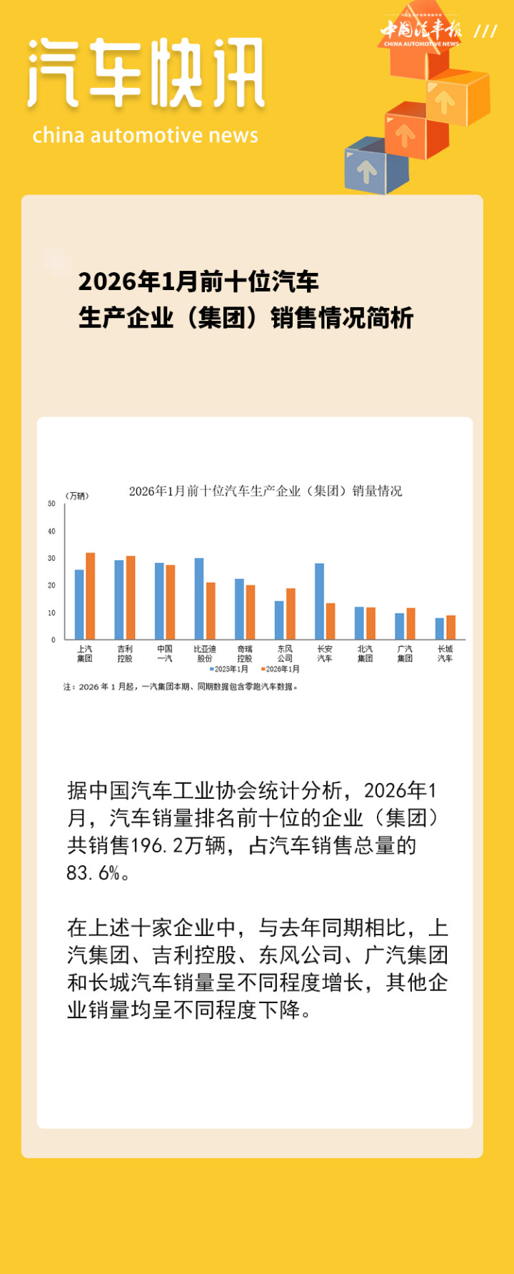 据中国汽车工业协会统计分析,2026年1月,汽车销量名次前十位的企业(集团)共销售196.2万辆,占汽车销售总量的83.6%。
