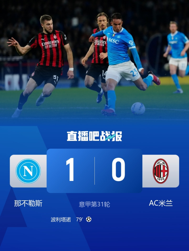 直播吧4月7日讯意甲第31轮比赛,AC米兰0-1不敌那不勒斯,吃到本赛季强强对话的首场败仗。