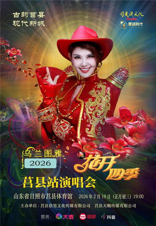 灵蛇辞岁,金马迎春。2026年的春节,山东日照市“千年古城”莒县因一场专属新春的音乐盛宴而年味愈发深厚。著名歌手乌兰图雅将携民族流行音乐IP“花开四季”演唱会,于马年大年头三(2月19日)登陆山东日照市莒县体育馆,用嘹亮歌声与关爱的道贺,为莒县及独揽全国献上一份惟一无二的新春文化厚礼,让草原风情与皆鲁年味碰撞出别样火花。